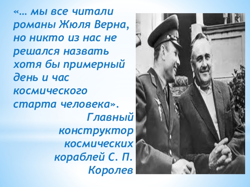 Космический полёт в подробностях, весьма близких к реальным, впервые был описан Ж. Верном в сочинениях «С Земли на Луну» (1865) и «Вокруг Луны» (1870). Эта знаменитая дилогия — выдающийся пример «видения сквозь время». Она была создана за 100 лет до того, как пилотируемый полёт вокруг Луны был реализован на практике.