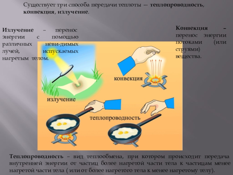 Существует три способа передачи теплоты — теплопроводность, конвекция, излучение.