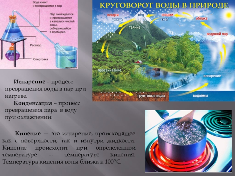 Кипение — это испарение, происходящее как с поверхности, так и изнутри жидкости. Кипение происходит при определенной температуре — температуре кипения. Температура кипения воды близка к 100°С.