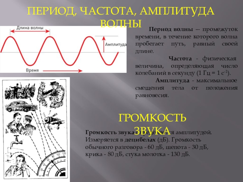 Громкость звука определяется амплитудой. Измеряется в децибелах (дБ). Громкость обычного разговора - 60 дБ, шепота - 30 дБ, крика - 80 дБ, стука молотка - 130 дБ.