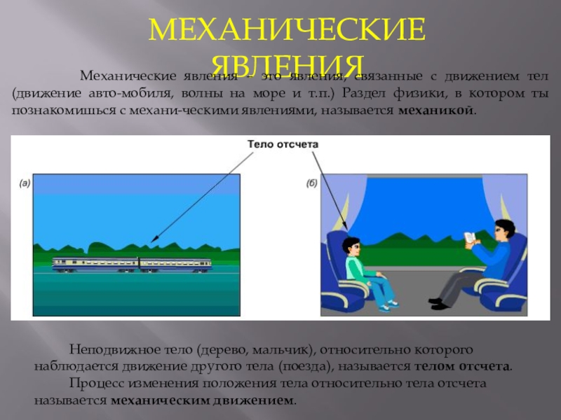 Неподвижное тело (дерево, мальчик), относительно которого наблюдается движение другого тела (поезда), называется телом отсчета.