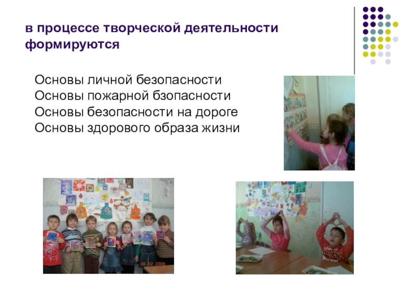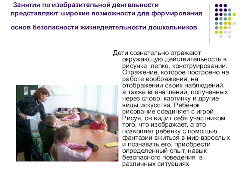 Дети сознательно отражают окружающую действительность в рисунке, лепке, конструировании. Отражение, которое построено на работе воображения, на отображении своих наблюдений, а также впечатлений, полученных через слово, картинку и другие виды искусства. Ребёнок рисование соединяет с игрой. Рисуя, он видит себя участником того, что изображает, а это позволяет ребёнку с помощью фантазии вжиться в мир взрослых и познавать его, приобрести определенный опыт, навык безопасного поведения в различных ситуациях