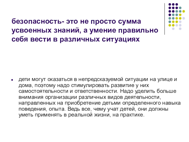 дети могут оказаться в непредсказуемой ситуации на улице и дома, поэтому надо стимулировать развитие у них самостоятельности и ответственности. Надо уделить больше внимания организации различных видов деятельности, направленных на приобретение детьми определенного навыка поведения, опыта. Ведь все, чему учат детей, они должны уметь применять в реальной жизни, на практике.