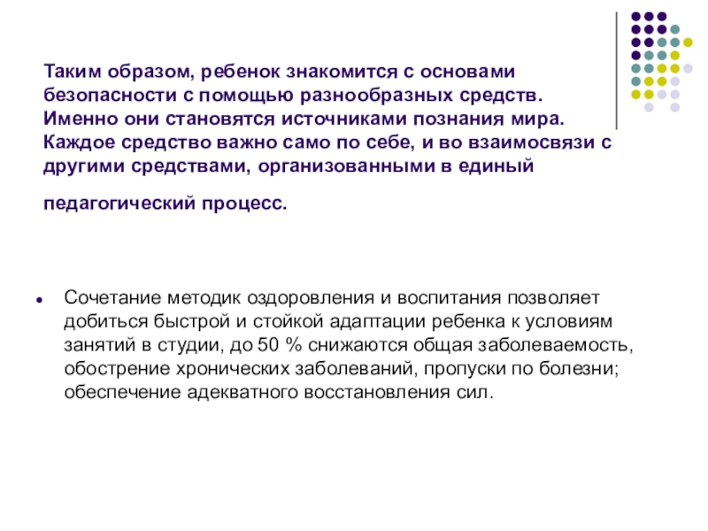 Сочетание методик оздоровления и воспитания позволяет добиться быстрой и стойкой адаптации ребенка к условиям занятий в студии, до 50 % снижаются общая заболеваемость, обострение хронических заболеваний, пропуски по болезни; обеспечение адекватного восстановления сил.