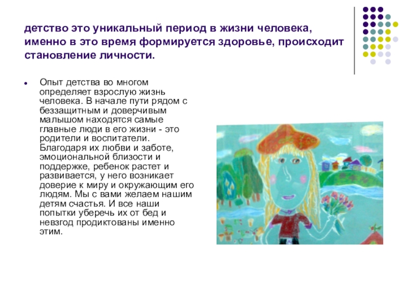 Опыт детства во многом определяет взрослую жизнь человека. В начале пути рядом с беззащитным и доверчивым малышом находятся самые главные люди в его жизни - это родители и воспитатели. Благодаря их любви и заботе, эмоциональной близости и поддержке, ребенок растет и развивается, у него возникает доверие к миру и окружающим его людям. Мы с вами желаем нашим детям счастья. И все наши попытки уберечь их от бед и невзгод продиктованы именно этим.