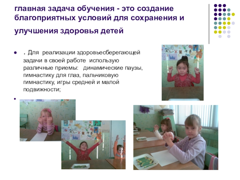 . Для реализации здоровьесберегающей задачи в своей работе использую различные приемы: динамические паузы, гимнастику для глаз, пальчиковую гимнастику, игры средней и малой подвижности;