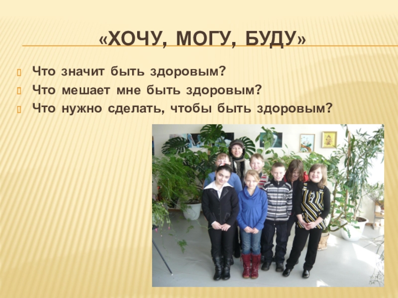 «хочу, могу, буду»Что значит быть здоровым?Что мешает мне быть здоровым?Что нужно сделать, чтобы быть здоровым?
