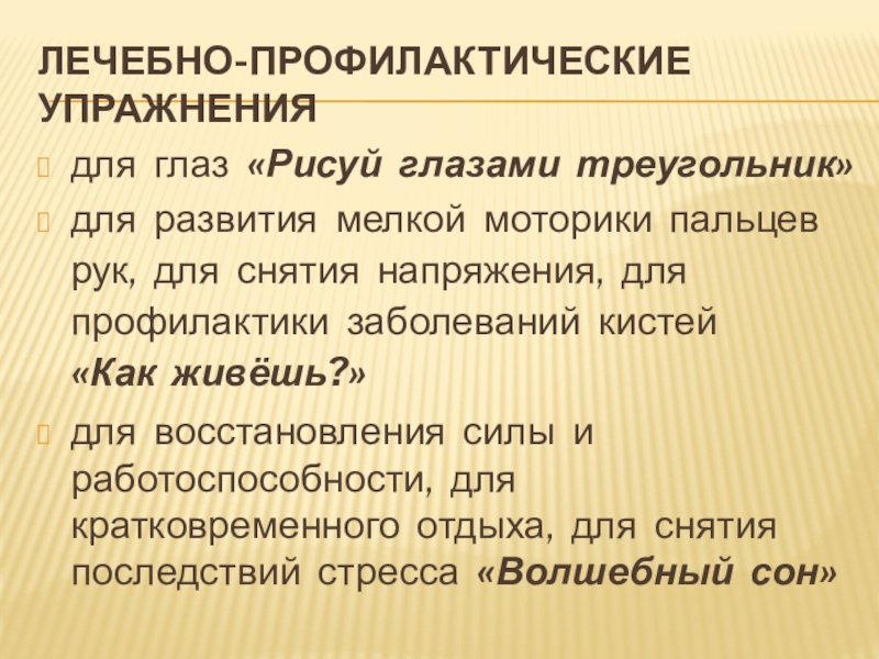 Лечебно-профилактические упражнениядля глаз «Рисуй глазами треугольник»для развития мелкой моторики пальцев рук, для снятия напряжения, для профилактики заболеваний