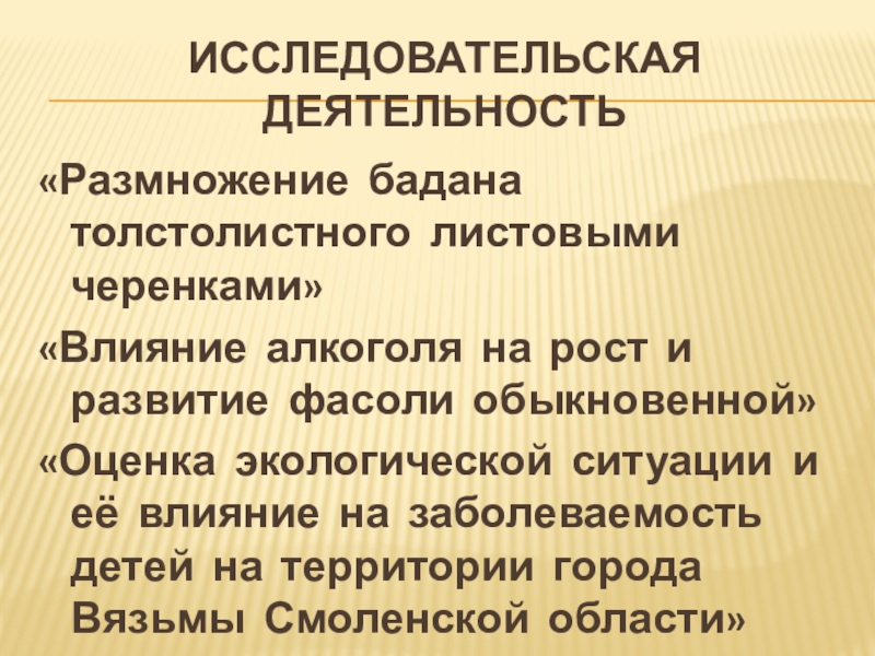 Исследовательская деятельность«Размножение бадана толстолистного листовыми черенками»«Влияние алкоголя на рост и развитие фасоли обыкновенной»«Оценка экологической ситуации и её