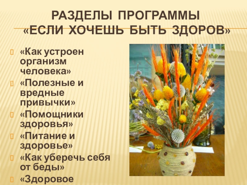 Разделы программы   «если хочешь быть здоров»«Как устроен организм человека»«Полезные и вредные привычки»«Помощники здоровья»«Питание и здоровье»«Как