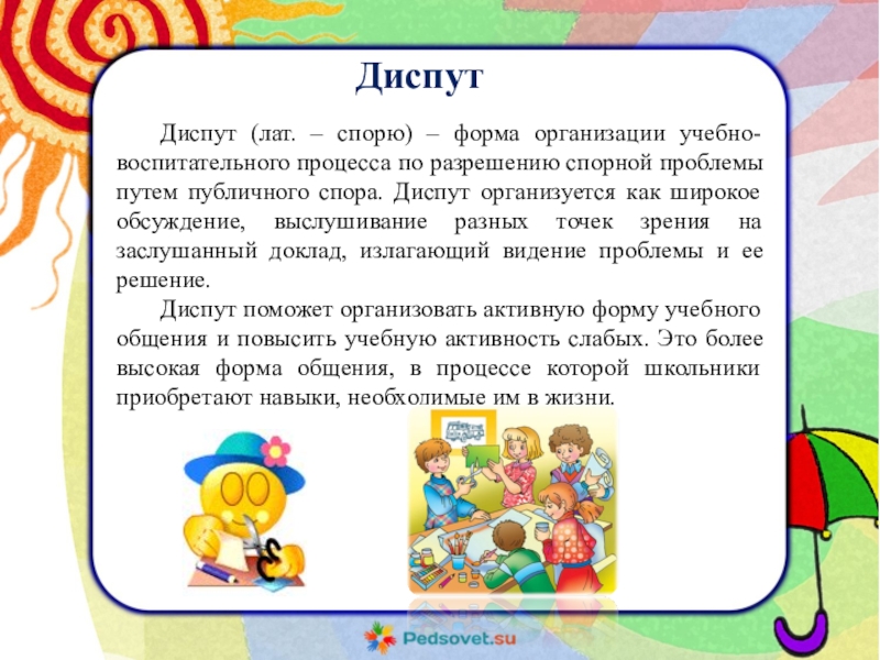 Диспут (лат. – спорю) – форма организации учебно-воспитательного процесса по разрешению