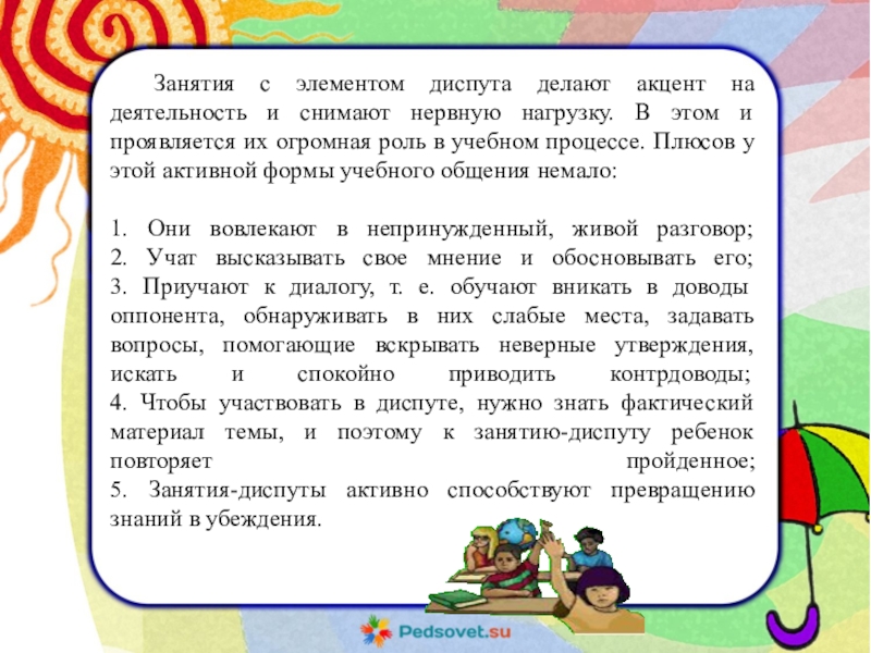 5. Занятия-диспуты активно способствуют превращению знаний в убеждения.