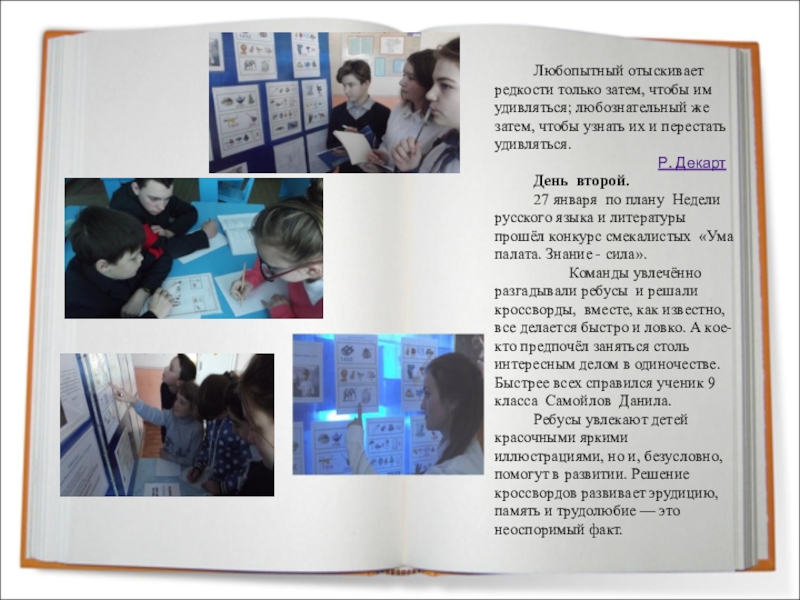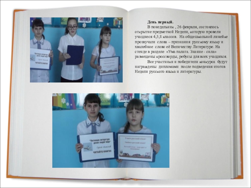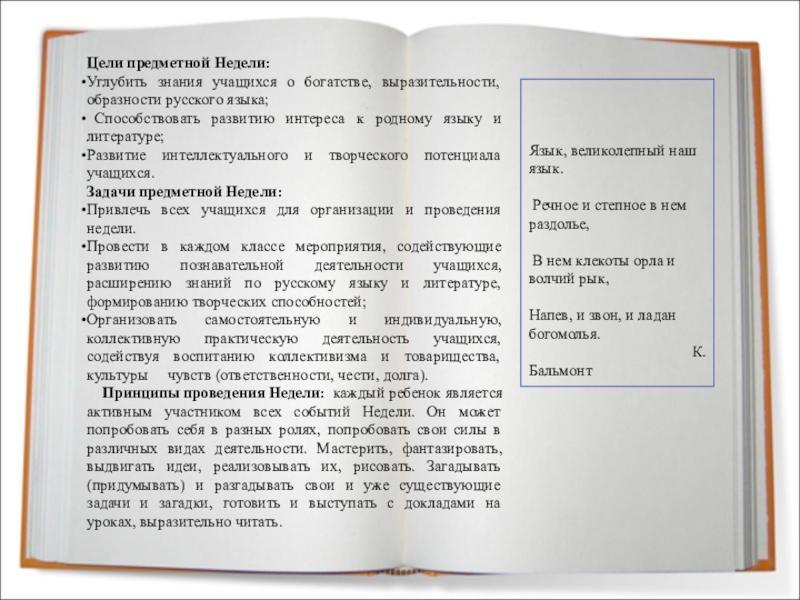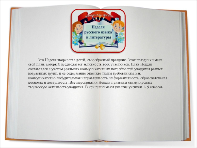 Принципы проведения Недели: каждый ребенок является активным участником всех событий Недели. Он может попробовать себя в разных ролях, попробовать свои силы в различных видах деятельности. Мастерить, фантазировать, выдвигать идеи, реализовывать их, рисовать. Загадывать (придумывать) и разгадывать свои и уже существующие задачи и загадки, готовить и выступать с докладами на уроках, выразительно читать.