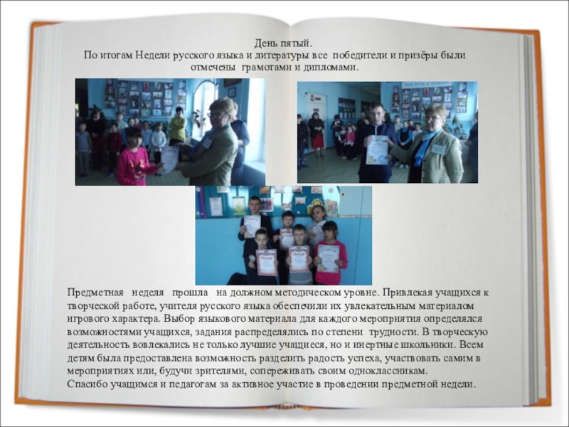 Предметная неделя прошла на должном методическом уровне. Привлекая учащихся к творческой работе, учителя русского языка обеспечили их увлекательным материалом игрового характера. Выбор языкового материала для каждого мероприятия определялся возможностями учащихся, задания распределялись по степени трудности. В творческую деятельность вовлекались не только лучшие учащиеся, но и инертные школьники. Всем детям была предоставлена возможность разделить радость успеха, участвовать самим в мероприятиях или, будучи зрителями, сопереживать своим одноклассникам.