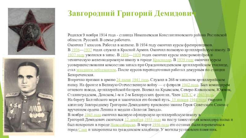 На берегу Балтийского моря и закончился его боевой путь. 15 января 1944 года гвардии капитану Завгороднему Григорию Демидовичу присвоено звание Героя Советского Союза с вручением ордена Ленина и медали «Золотая Звезда».