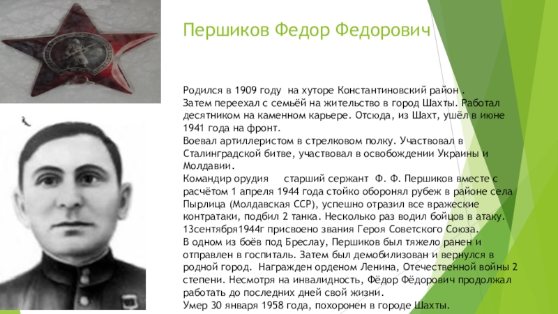 Командир орудия старший сержант Ф. Ф. Першиков вместе с расчётом 1 апреля 1944 года стойко оборонял рубеж в районе села Пырлица (Молдавская ССР), успешно отразил все вражеские контратаки, подбил 2 танка. Несколько раз водил бойцов в атаку. 13сентября1944г присвоено звания Героя Советского Союза.