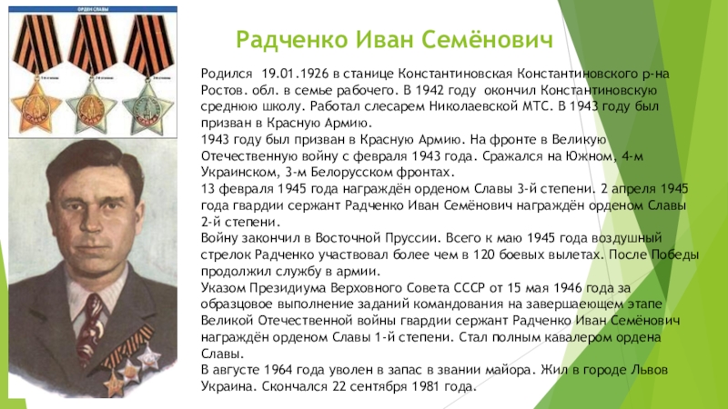 Указом Президиума Верховного Совета СССР от 15 мая 1946 года за образцовое выполнение заданий командования на завершаеющем этапе Великой Отечественной войны гвардии сержант Радченко Иван Семёнович награждён орденом Славы 1-й степени. Стал полным кавалером ордена Славы.