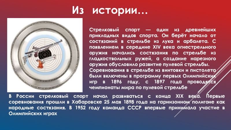 В России стрелковый спорт начал развиваться с конца XIX века. Первые соревнования прошли в Хабаровске 25 мая 1898 года на гарнизонном полигоне как народные состязания. В 1952 году команда СССР впервые принимала участие в Олимпийских играх