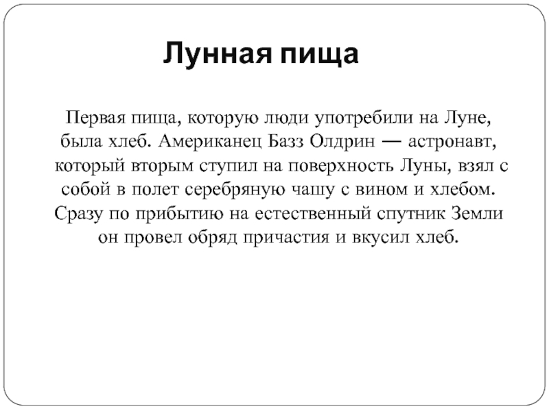 Лунная пищаПервая пища, которую люди употребили на Луне, была хлеб. Американец Базз Олдрин — астронавт, который вторым
