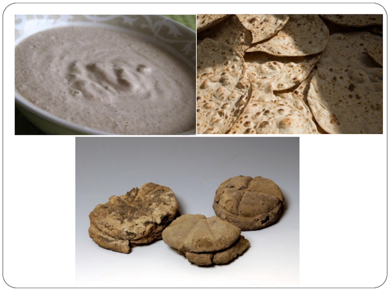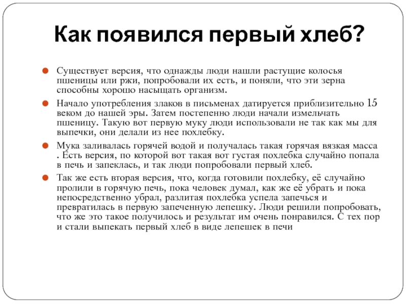 Мука заливалась горячей водой и получалась такая горячая вязкая масса . Есть версия, по которой вот такая вот густая похлебка случайно попала в печь и запеклась, и так люди попробовали первый хлеб.