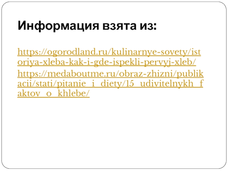 Информация взята из:https://ogorodland.ru/kulinarnye-sovety/istoriya-xleba-kak-i-gde-ispekli-pervyj-xleb/https://medaboutme.ru/obraz-zhizni/publikacii/stati/pitanie_i_diety/15_udivitelnykh_faktov_o_khlebe/
