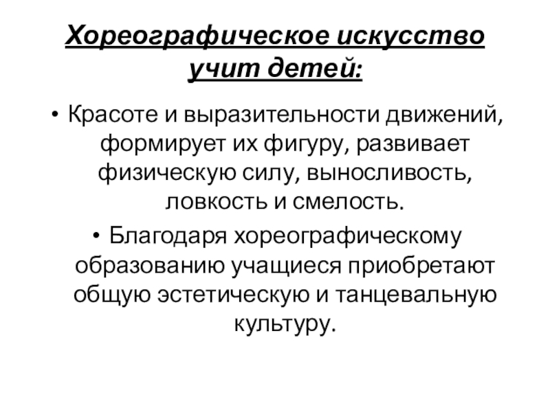 Хореографическое искусство учит детей:Красоте и выразительности движений, формирует их фигуру, развивает физическую силу, выносливость, ловкость и смелость.Благодаря хореографическому образованию учащиеся приобретают общую эстетическую и танцевальную культуру.