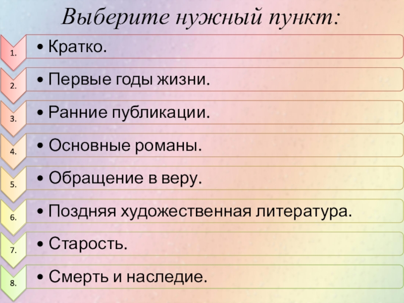 духовный кризис и находился в депрессии. Следующий этап биографии Льва Толстого характеризуется поиском смысла жизни.