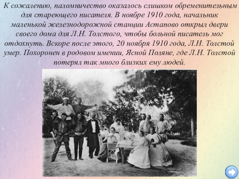 1910 года, начальник маленькой железнодорожной станции Астапово открыл двери своего дома для Л.Н. Толстого, чтобы больной писатель мог отдохнуть. Вскоре после этого, 20 ноября 1910 года, Л.Н. Толстой умер. Похоронен в родовом имении, Ясной Поляне, где Л.Н. Толстой потерял так много близких ему людей.