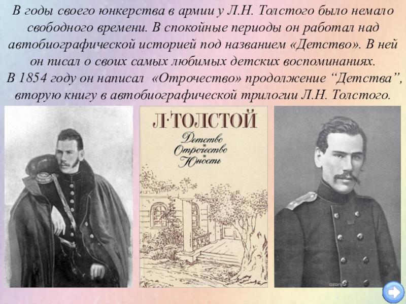 Слайд 6В годы своего юнкерства в армии у Л.Н. Толстого было немало