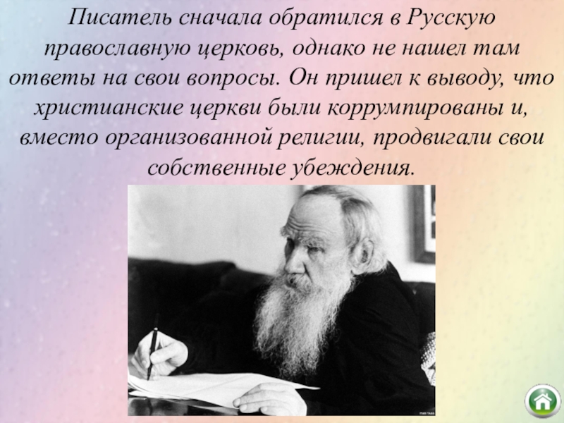 Слайд 11Писатель сначала обратился в Русскую православную церковь, однако не нашел там