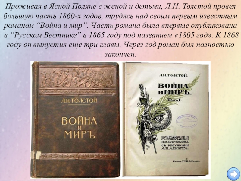 большую часть 1860-х годов, трудясь над своим первым известным романом “Война и мир”. Часть романа была впервые опубликована в “Русском Вестнике” в 1865 году под названием «1805 год». К 1868 году он выпустил еще три главы. Через год роман был полностью закончен.
