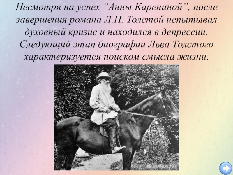 Слайд 10Несмотря на успех “Анны Карениной”, после завершения романа Л.Н. Толстой испытывал