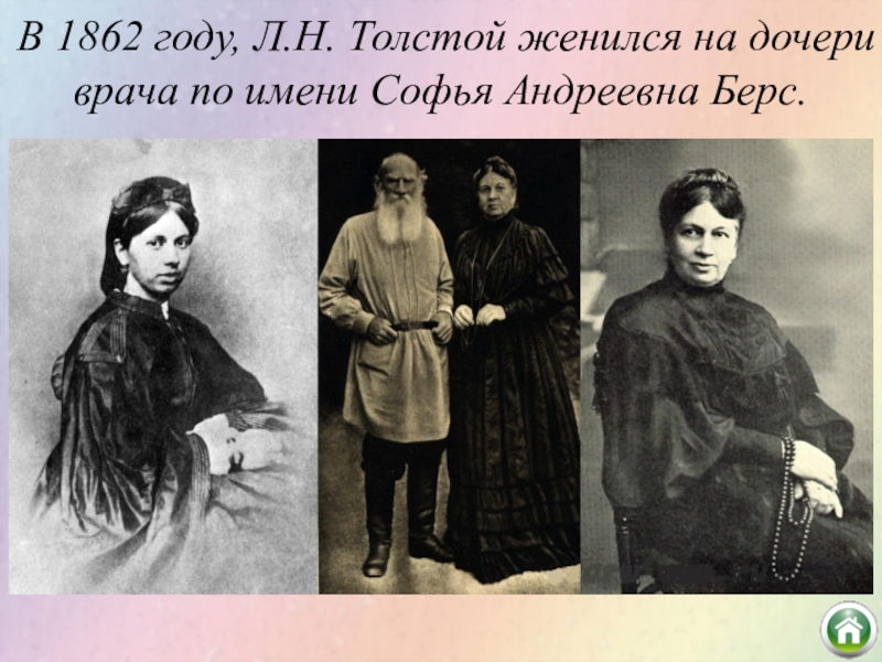 Слайд 7В 1862 году, Л.Н. Толстой женился на дочери врача по имени