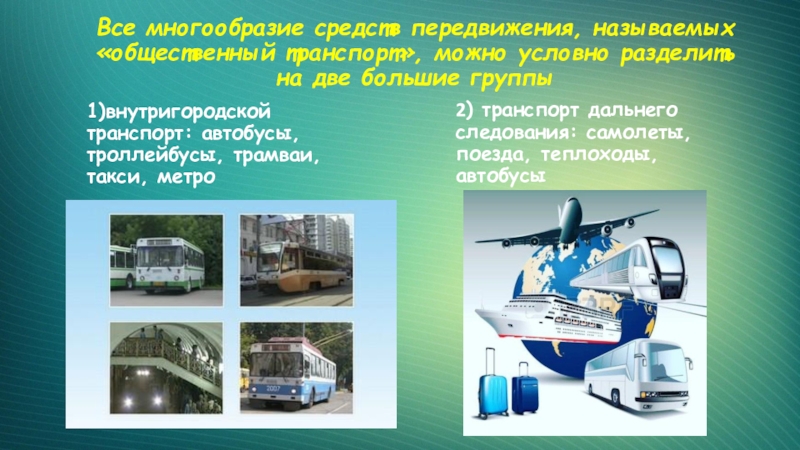 Слайд 15Все многообразие средств передвижения, называемых «общественный транспорт», можно условно разделить на