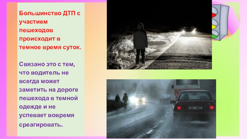Слайд 39Большинство ДТП с участием пешеходов происходит в темное время суток.