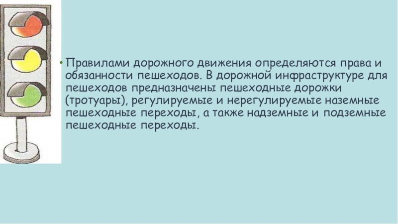 Правилами дорожного движения определяются права и обязанности пешеходов. В дорожной инфраструктуре