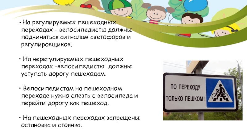 На нерегулируемых пешеходных переходах –велосипедисты должны уступать дорогу пешеходам.