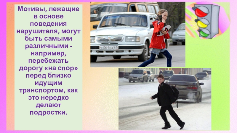 например, перебежать дорогу «на спор» перед близко идущим транспортом, как это нередко делают подростки.