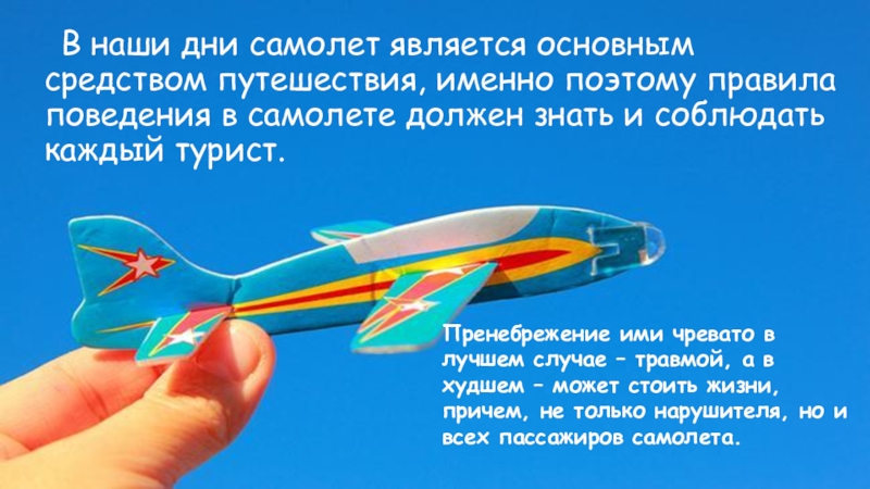 Слайд 21 В наши дни самолет является основным средством путешествия, именно поэтому правила