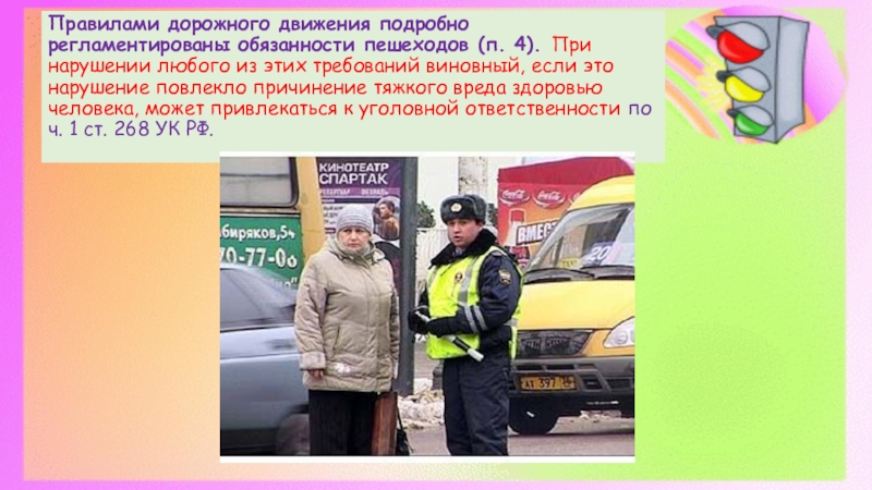 Слайд 32Правилами дорожного движения подробно регламентированы обязанности пешеходов (п. 4). При нарушении