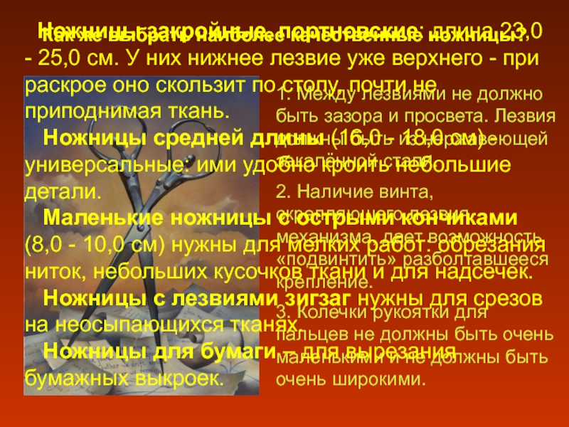 Ножницы закройные, портновские: длина 23,0 - 25,0 см. У них нижнее лезвие уже верхнего - при раскрое оно скользит по столу, почти не приподнимая ткань.