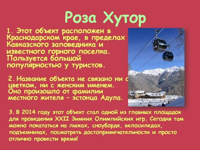 3. В 2014 году этот объект стал одной из главных площадок для проведения XXII Зимних Олимпийских игр. Сегодня там можно покататься на лыжах, сноуборде, велосипедах, подъемниках, посмотреть достопримечательности и просто отлично провести время!