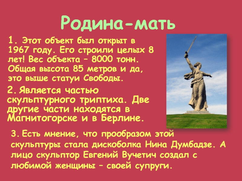 3. Есть мнение, что прообразом этой скульптуры стала дискоболка Нина Думбадзе. А лицо скульптор Евгений Вучетич создал с любимой женщины – своей супруги.