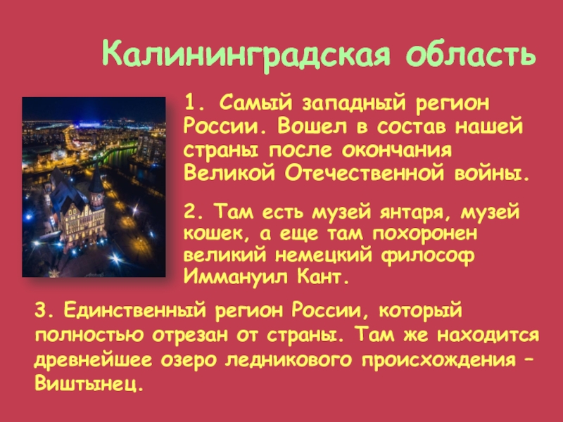 3. Единственный регион России, который полностью отрезан от страны. Там же находится древнейшее озеро ледникового происхождения – Виштынец.