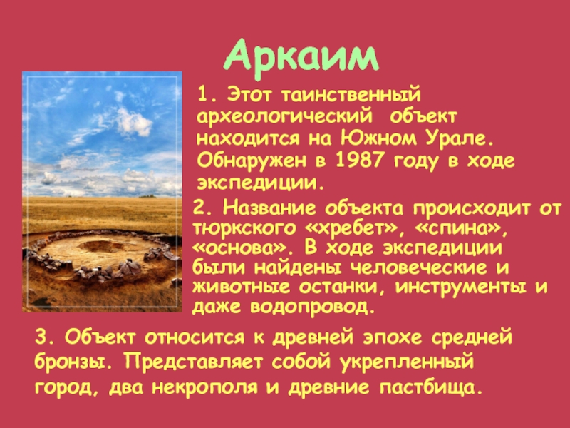 2. Название объекта происходит от тюркского «хребет», «спина», «основа». В ходе экспедиции были найдены человеческие и животные останки, инструменты и даже водопровод.