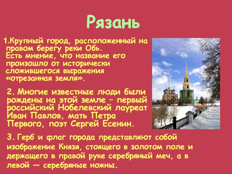 2. Многие известные люди были рождены на этой земле – первый российский Нобелевский лауреат Иван Павлов, мать Петра Первого, поэт Сергей Есенин.