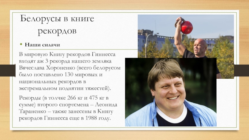 3 рекорда нашего земляка Вячеслава Хороненко (всего белорусом было поставлено 130 мировых и национальных рекордов в экстремальном поднятии тяжестей).