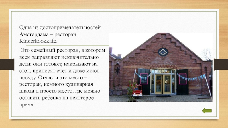 Слайд 21Одна из достопримечательностей Амстердама – ресторан Kinderkookkafe.