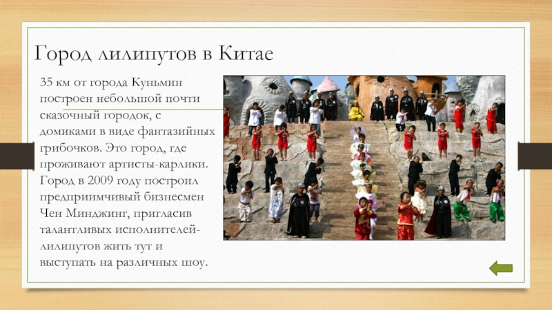 сказочный городок, с домиками в виде фантазийных грибочков. Это город, где проживают артисты-карлики. Город в 2009 году построил предприимчивый бизнесмен Чен Минджинг, пригласив талантливых исполнителей-лилипутов жить тут и выступать на различных шоу.