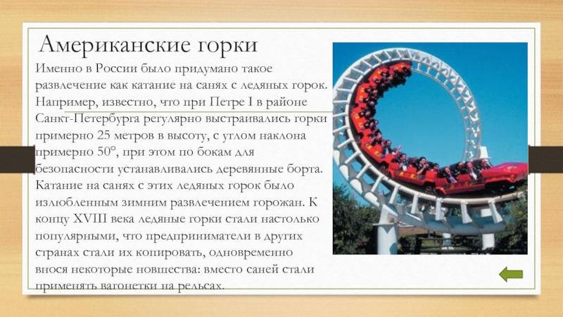 санях с ледяных горок. Например, известно, что при Петре I в районе Санкт-Петербурга регулярно выстраивались горки примерно 25 метров в высоту, с углом наклона примерно 50°, при этом по бокам для безопасности устанавливались деревянные борта. Катание на санях с этих ледяных горок было излюбленным зимним развлечением горожан. К концу XVIII века ледяные горки стали настолько популярными, что предприниматели в других странах стали их копировать, одновременно внося некоторые новшества: вместо саней стали применять вагонетки на рельсах.